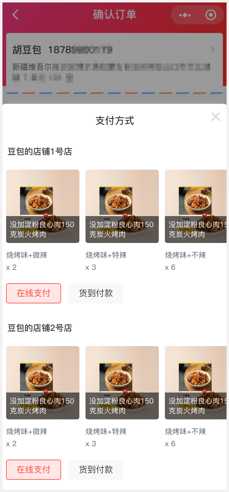 多商户下单页面显示每个商品的名称、规格、数量,商品可以左右滑动。