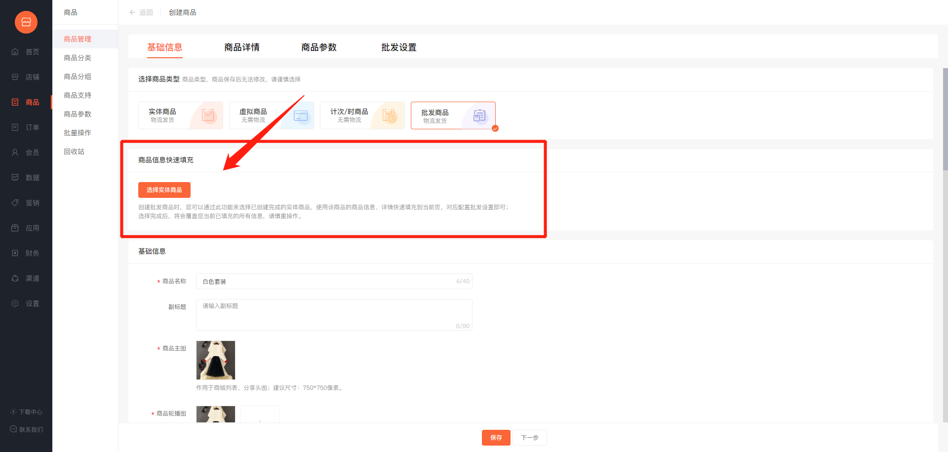 创建批发商品时,新增商品信息快速填充功能,您可以通过此功能将已创建完成的实体商品信息和详情快速填充到当前页面。