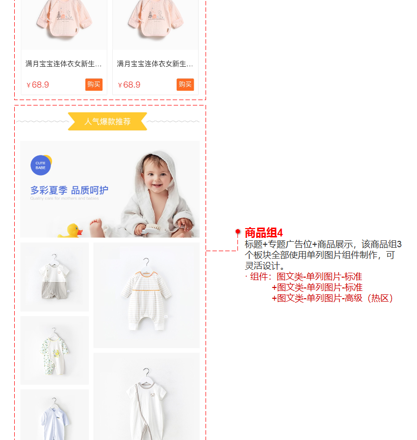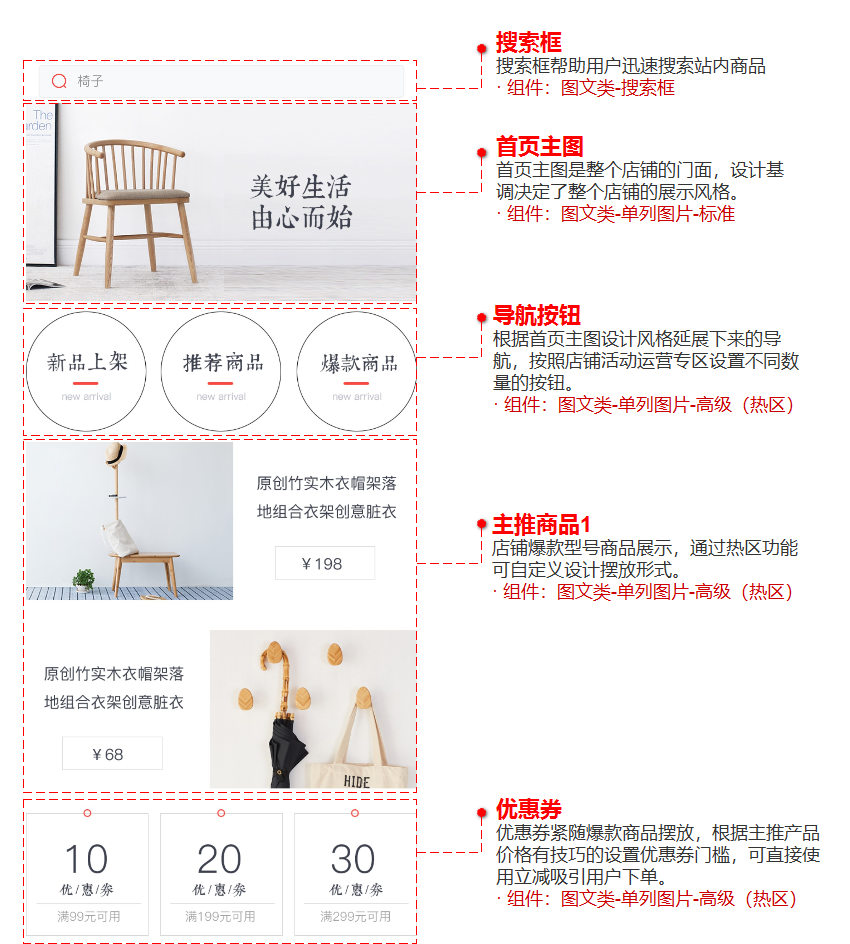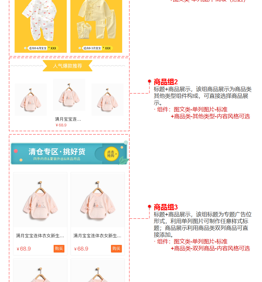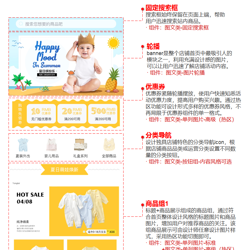 使用组件:固定搜索框、图片轮播、单列图片、单列图片热区、按钮组、商品其他类型、双列商品