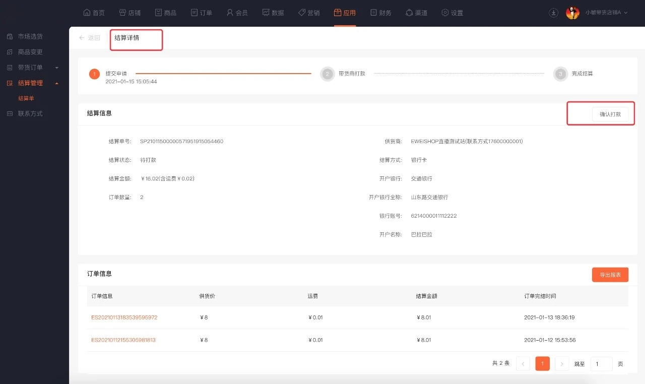 ①带货商收款模式:带货出售商品由带货商收款,供货商生成结算单后和带货商进行线下结算。