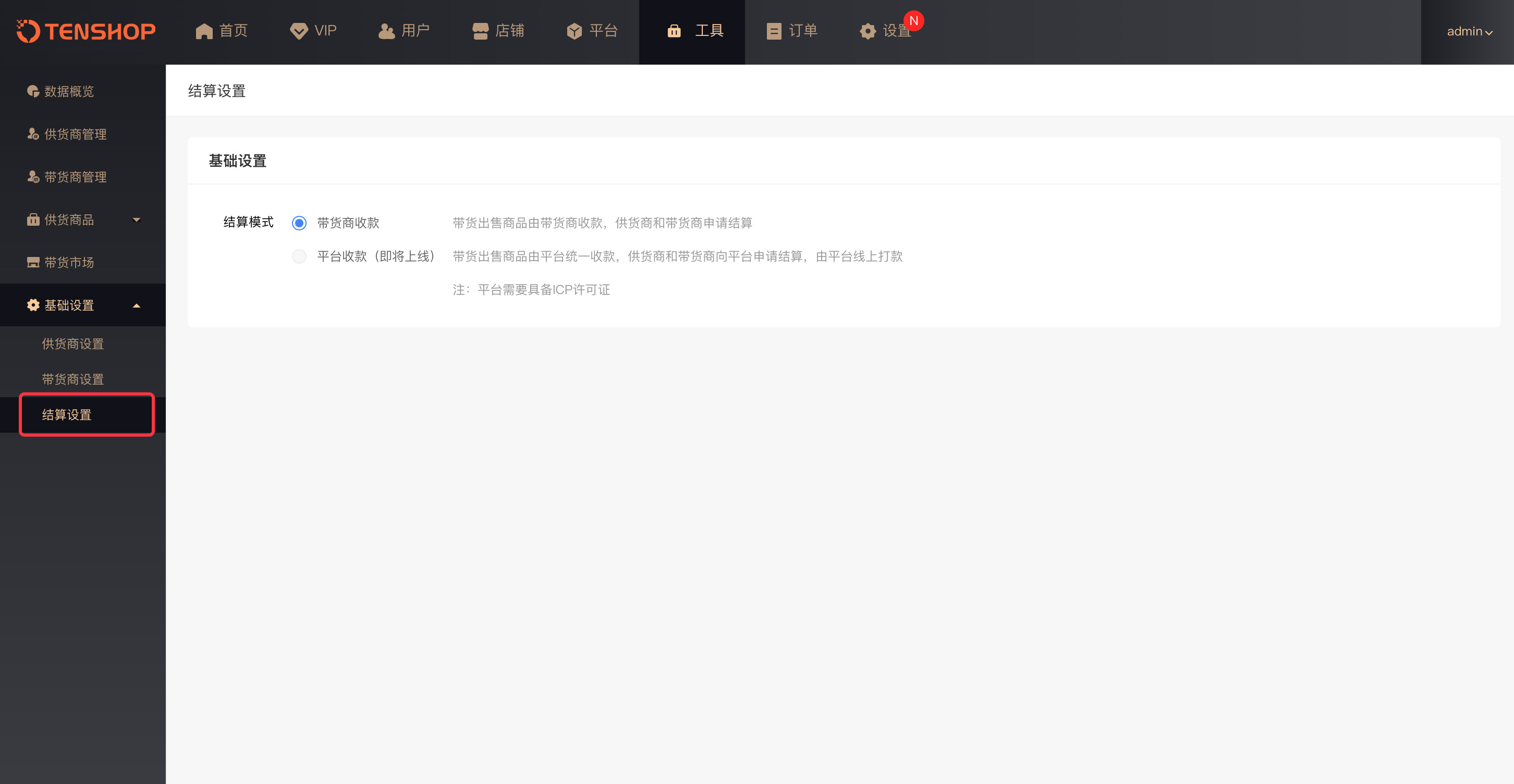 ②平台收款模式【即将上线】:带货出售商品由平台统一收款,供货商和带货商向平台申请结算(注:平台需要具备ICP许可证)。