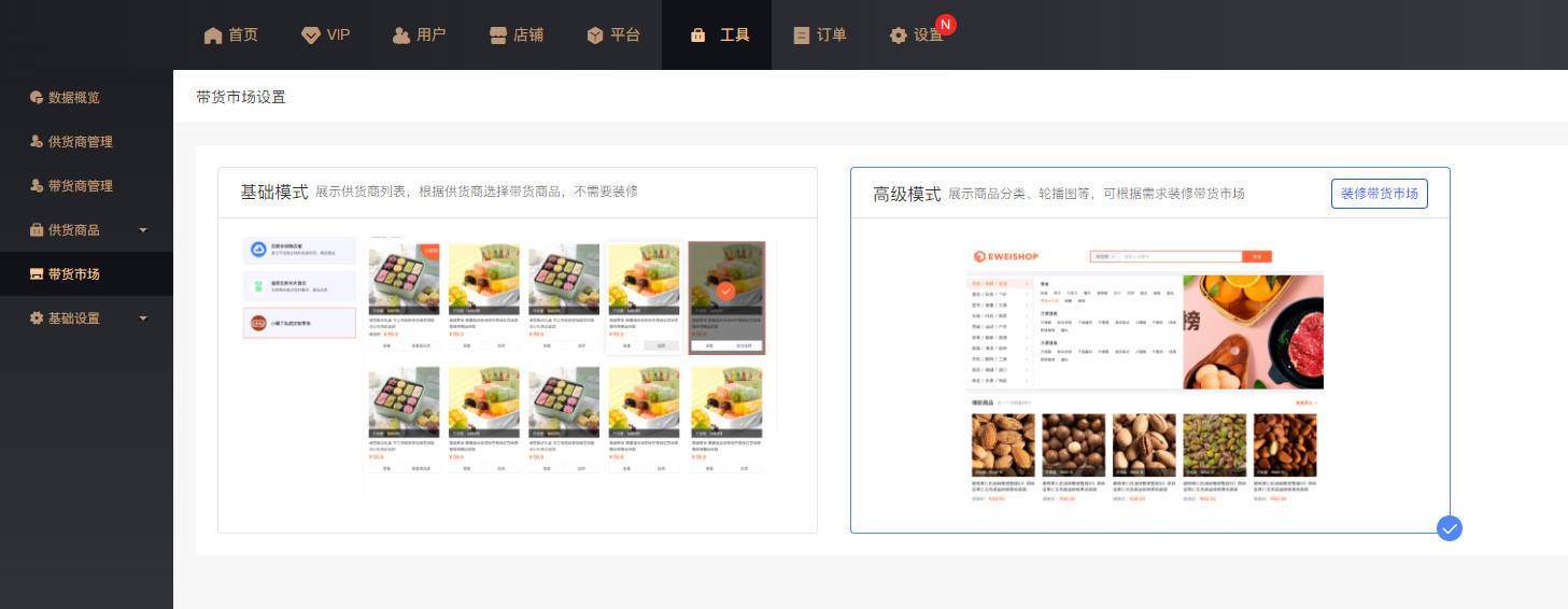 ·系统提供“基础模式”和“高级模式”两种带货市场样式。