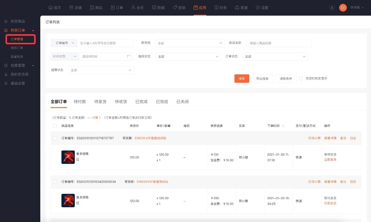·供货订单将显示商品供货价、供货结算金额和带货商信息,供货订单需要由供货商发货。