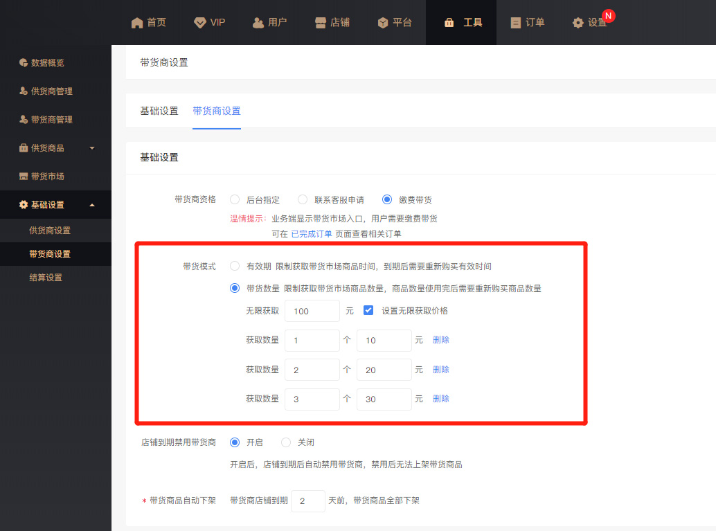 ·可选择限制带货商获取带货市场商品时间的“有效期”模式,或限制获取商品数量的“带货数量”模式。
