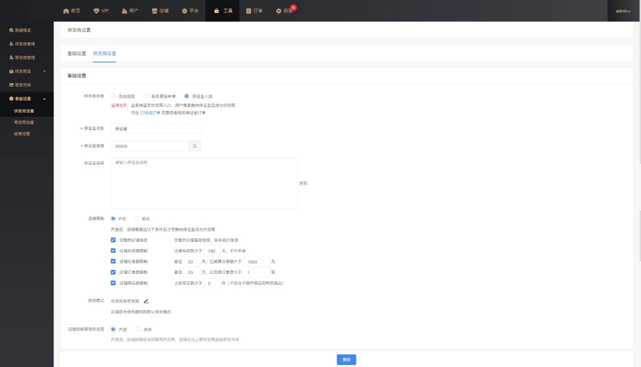 ·其中保证金入驻方式还可以开启“店铺交易额”、“店铺商品数”等成为供货商的店铺门槛。