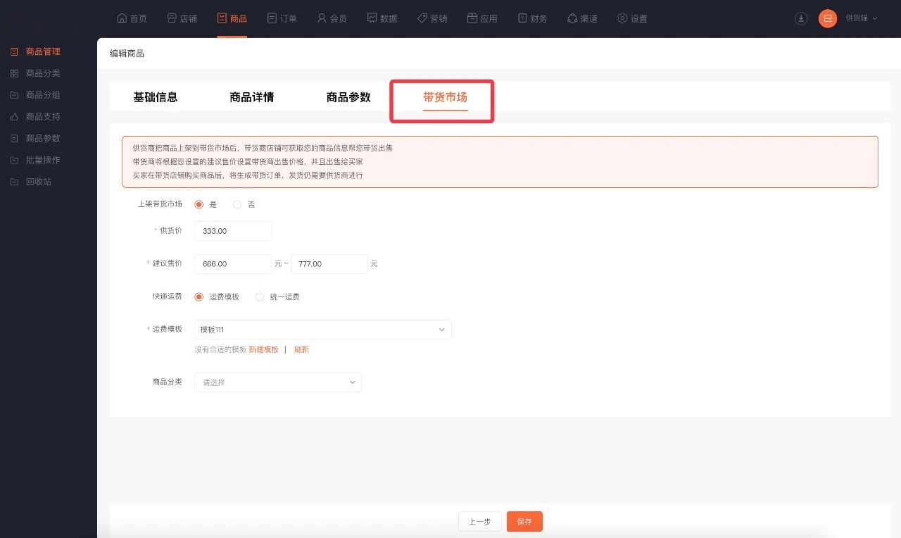 ·供货商商品设置供货价、建议零售价、商品运费后可上架到带货市场。