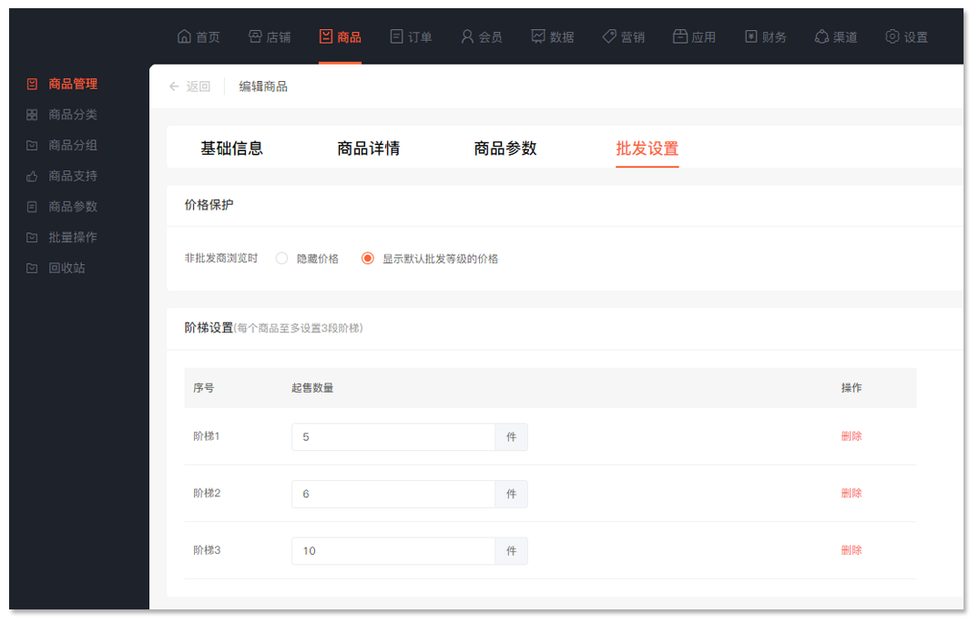 · 后台可设置是否对非批发商隐藏批发价格,并引导用户成为批发商。