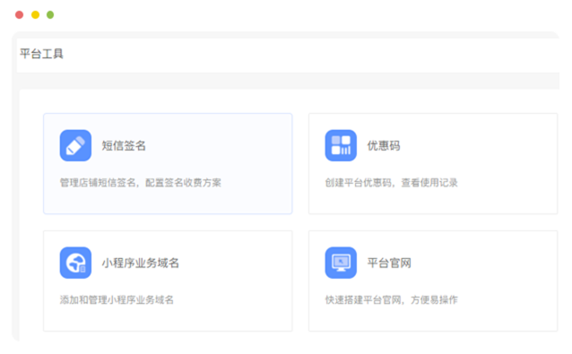 工具菜单功能目前包含“短信签名”,“优惠码”,“系统公告”,“小程序业务域名”,“平台官网”,“平台广告”,“独立存储”,“数据管理”等,后续会继续升级更多实用功能,敬请期待!