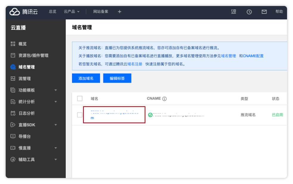 3、添加推流域名:腾讯云直播将提供推流域名(腾讯云 - 云直播 - 域名管理页面),复制推流域名添加到域名设置页面推流域名部分;