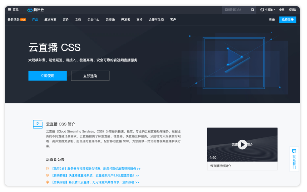 1、注册腾讯云账号,进入云直播CSS页面,前往腾讯云直播;