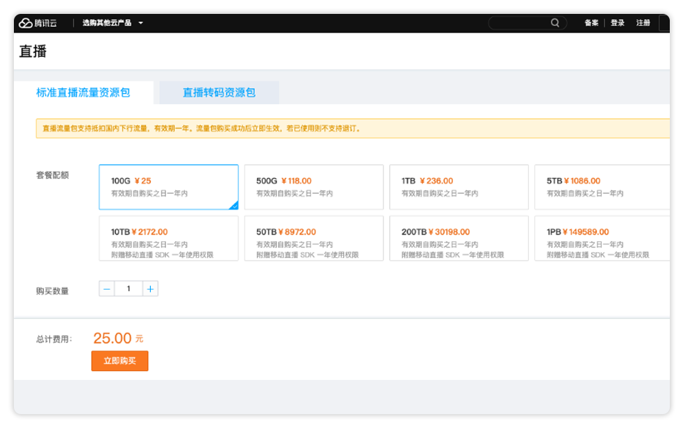2、前往购买直播流量页面购买流量资源包(下图价格仅供参考);