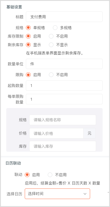 支持设置库存和限购,并且可以与日历组件联动,结算金额=售价*日历天数*数量。