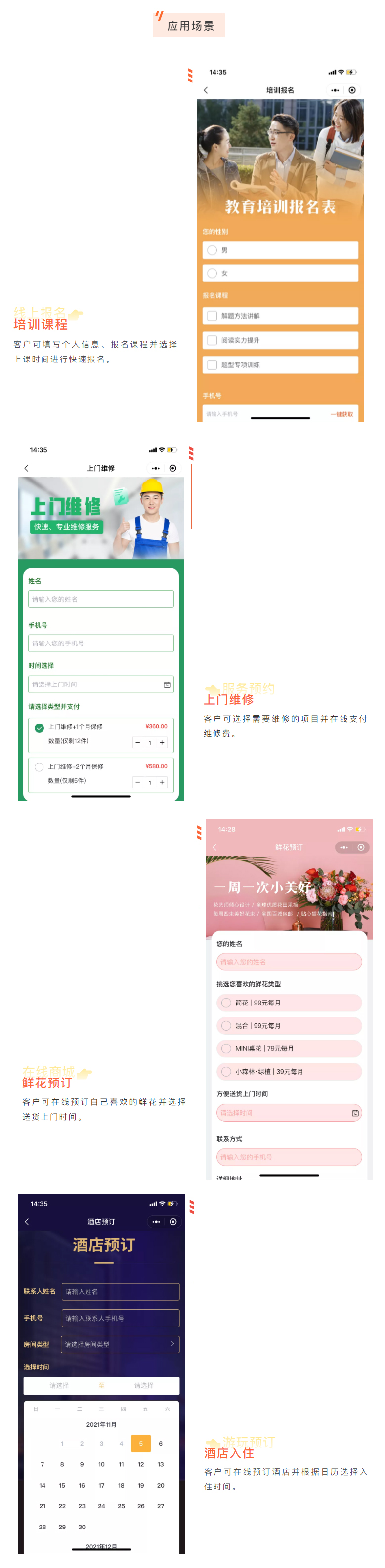 当然,除了上面提到的四种场景外,私教预约、在线订水、服装定制、活动报名、医疗挂号、外卖订餐…这些场景都不在话下,可大大简化企业的服务和管理流程。
