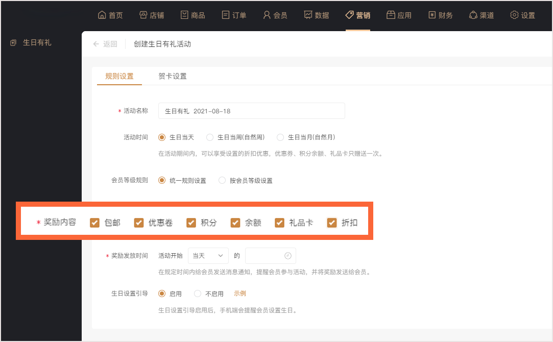 生日礼包含包邮/赠送优惠券/赠送积分/赠送余额/赠送礼品卡/打折六种类型,且可以从中选择多种奖励赠送给会员。