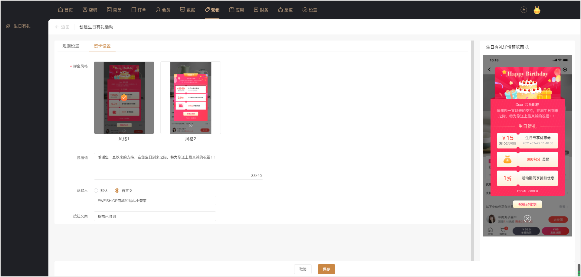 商户可以自定义生日贺卡的风格和祝福语、落款内容,强调生日仪式感,增强会员黏性和归属感。