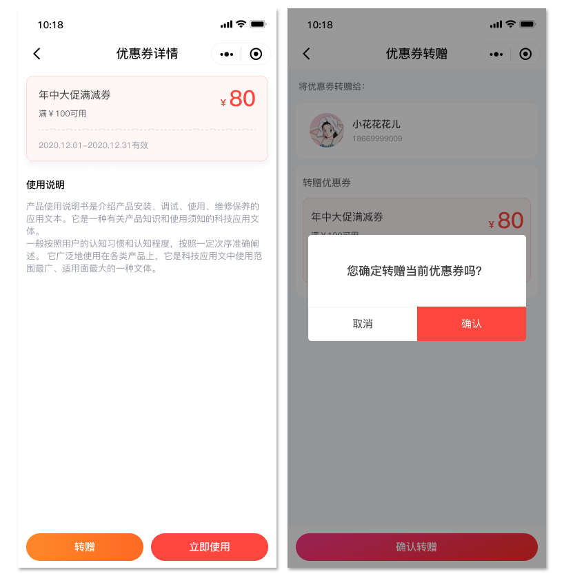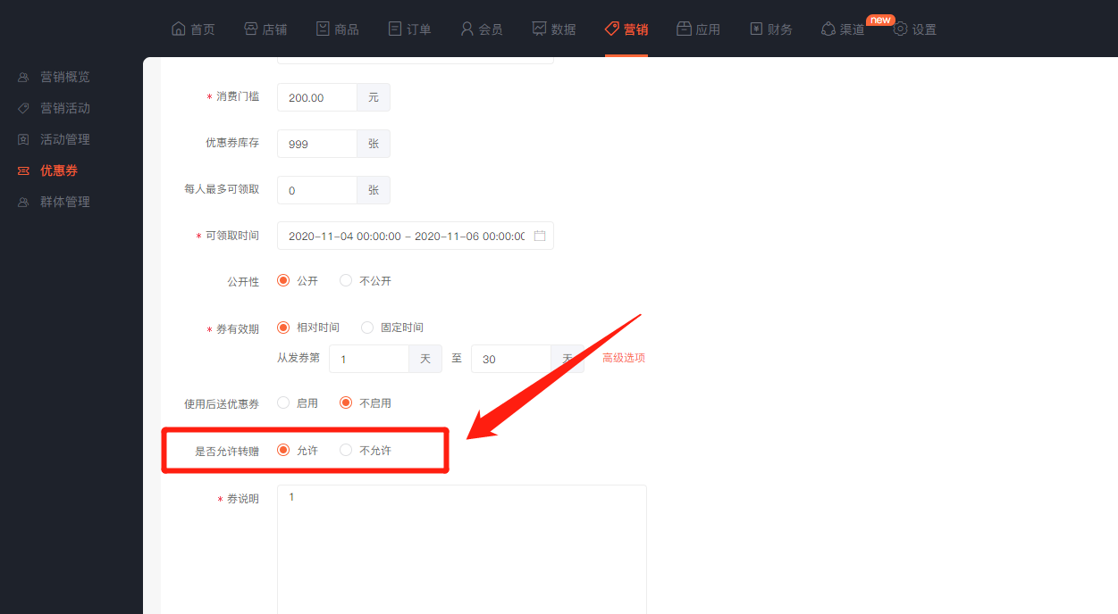 在优惠券编辑中可以根据营销策略设置指定优惠券是否允许转赠。