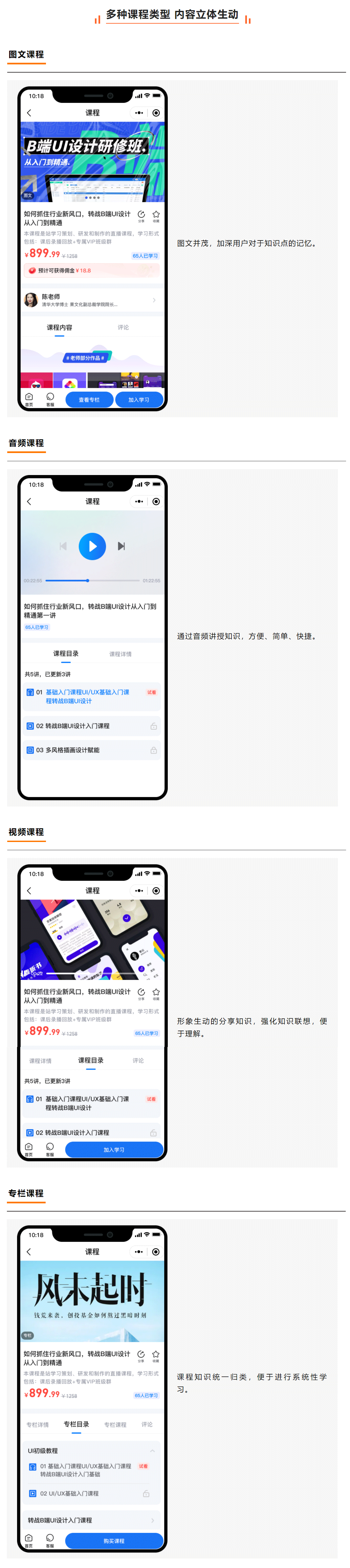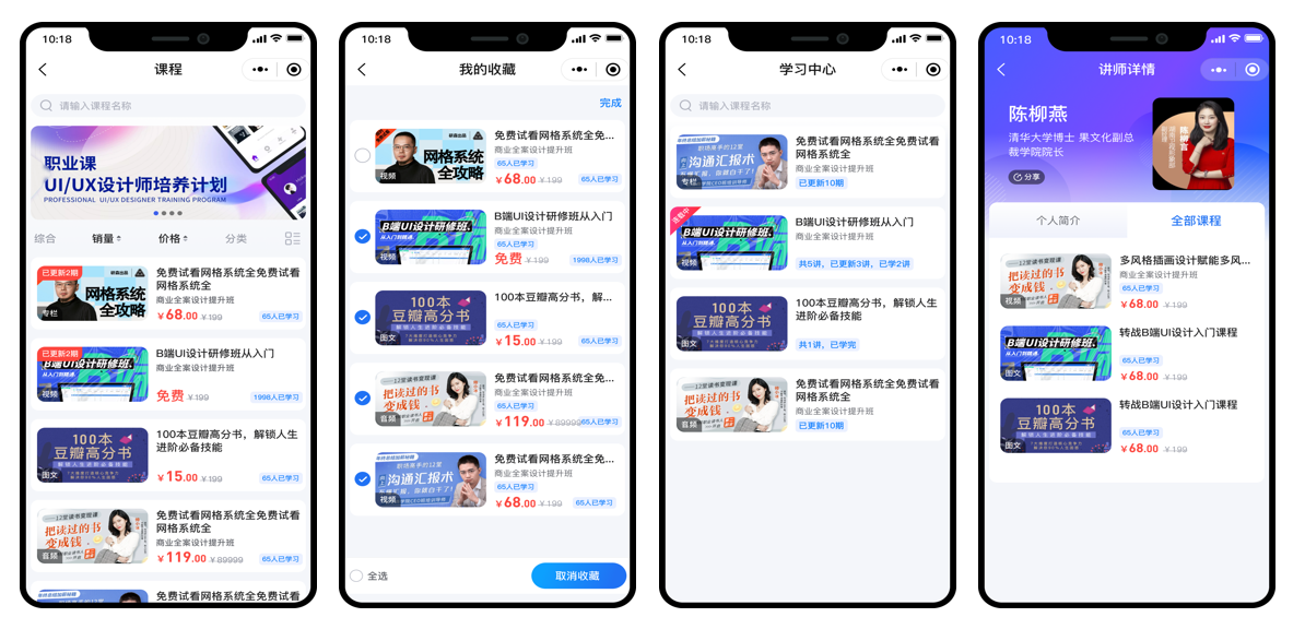 设立讲师专栏和讲师详情页面,树立讲师形象,便于用户付费学习同一讲师课程,增强用户粘性。