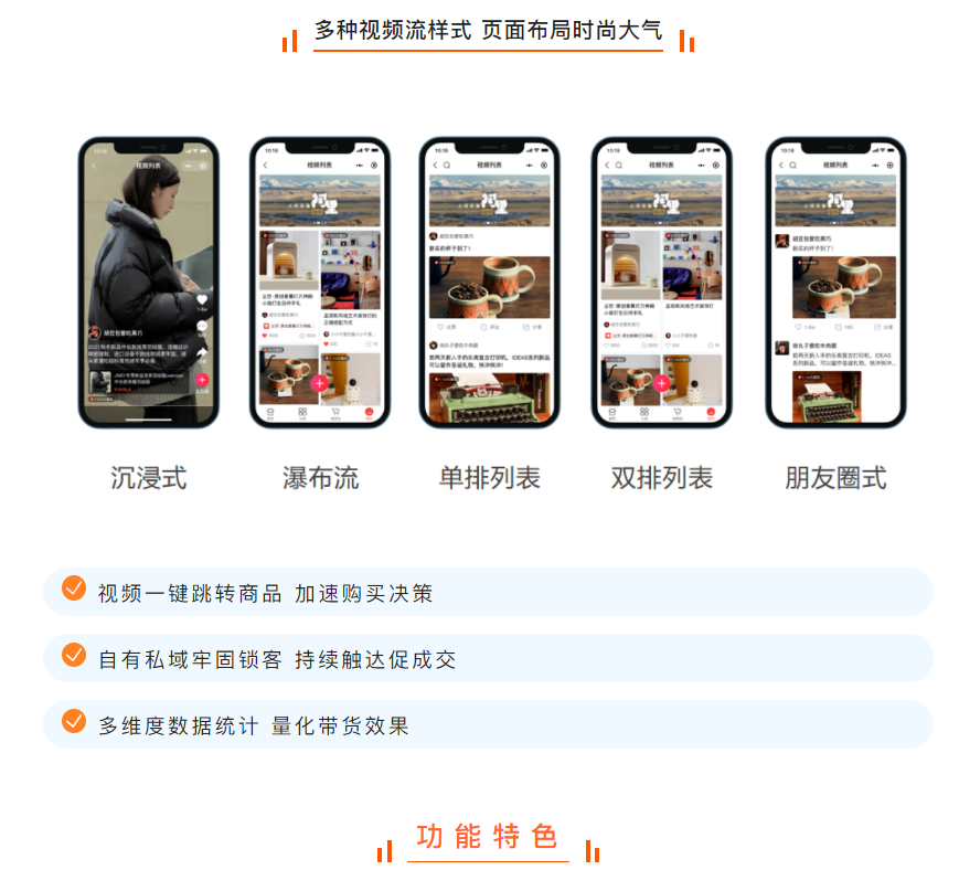 02 // 视频发布者可以为实体商品、虚拟商品、计次时商品等多种类型商品进行视频带货,且支持多商户商品。
