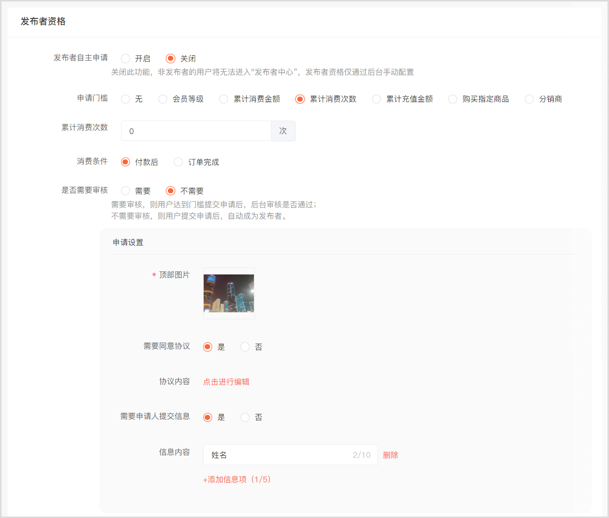 01 // 自定义申请成为“发布者”的门槛条件和审核方式,提交申请并审核通过的用户才能发布视频带货。