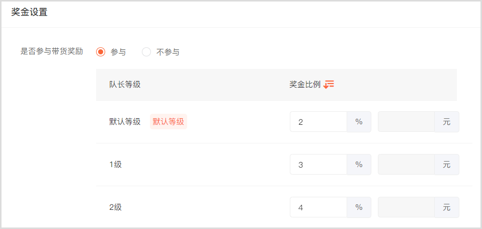03 // 支持给不同的商品设置不同比例的带货奖金,且可根据发布者等级进行差异化设置,激励用户升级。