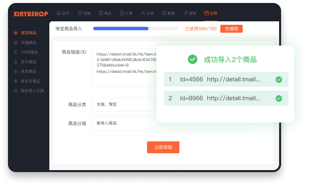 可批量导入商品信息,展示商品获取进度,获取完成后展示已成功获取商品数量和总商品数量。