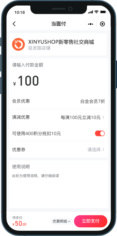 支持会员等级折扣、会员卡折扣、满减优惠、积分抵扣、优惠券、消费奖励等优惠叠加使用。