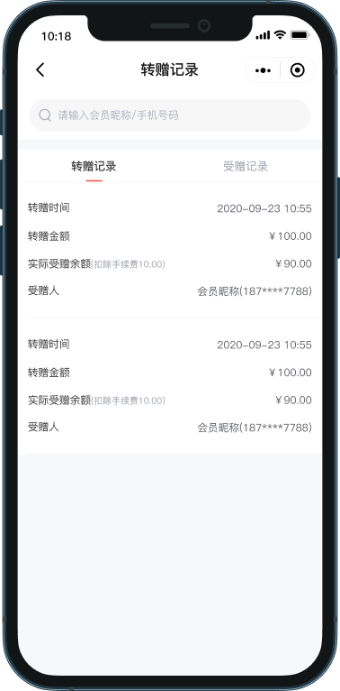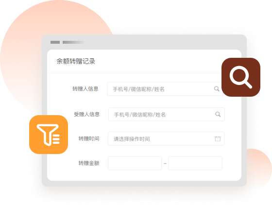 商家可根据手机号、会员昵称、姓名、时间、额度等筛选查看详细的转赠记录,方便快捷。