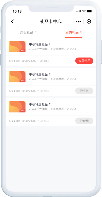 自定义卡面、库存、售价等信息;礼品卡关联兑换码,转赠方便,使用更人性化。