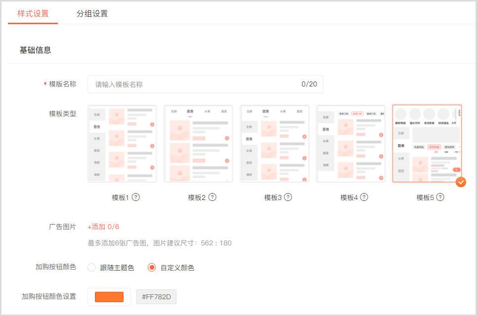 02 / 新增三级分类模板(模板5),并且可自定义加购按钮颜色。