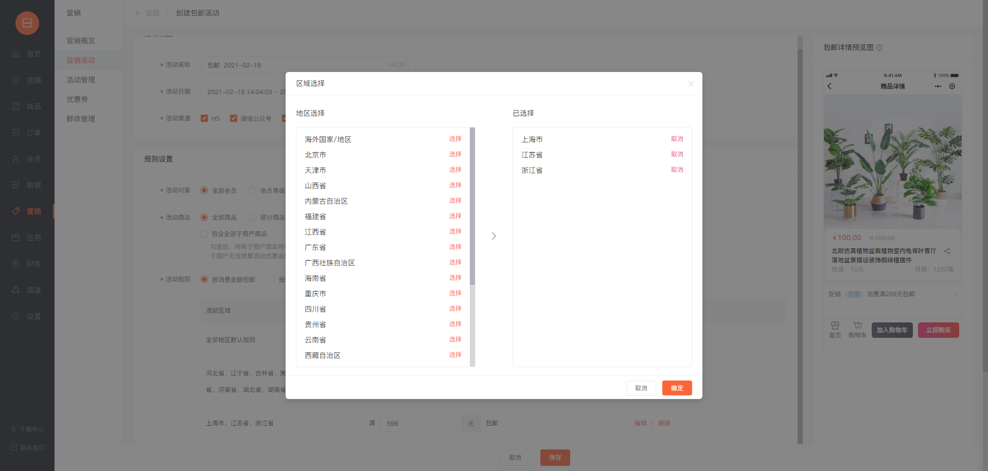 在包邮活动中可以按照不同的区域设置不一样的包邮额度。