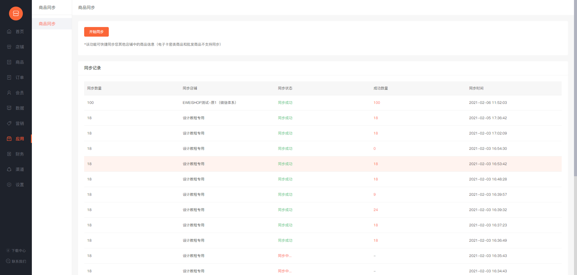 该功能可快捷同步您同一个用户名下的其他店铺中的商品信息,状态显示分为同步中/同步完成/同步失败3种。