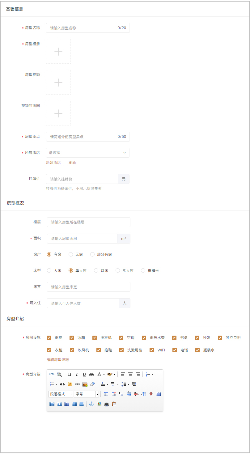 支持创建多个房型,并添加房型名称、相册、视频、卖点、挂牌价、楼层、面积、床型、入住人数、设施等客房详细信息。