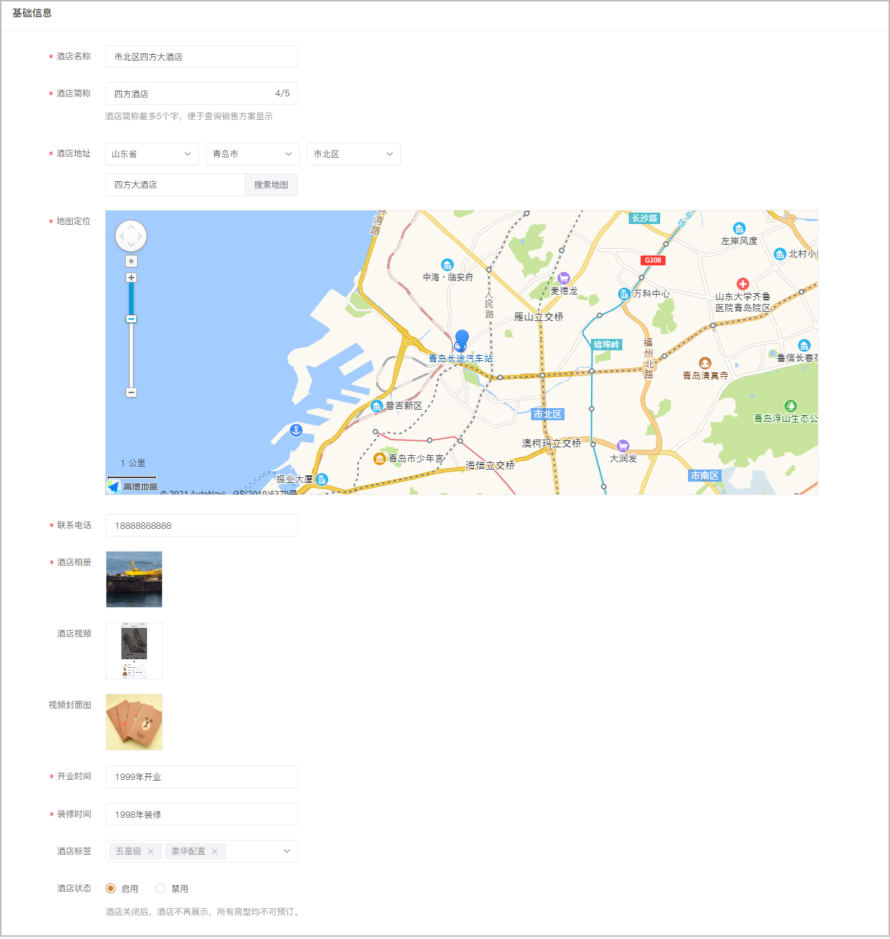 支持添加酒店名称、地址、定位、电话、相册、视频、开业时间、装修时间、设施服务等酒店详细信息。