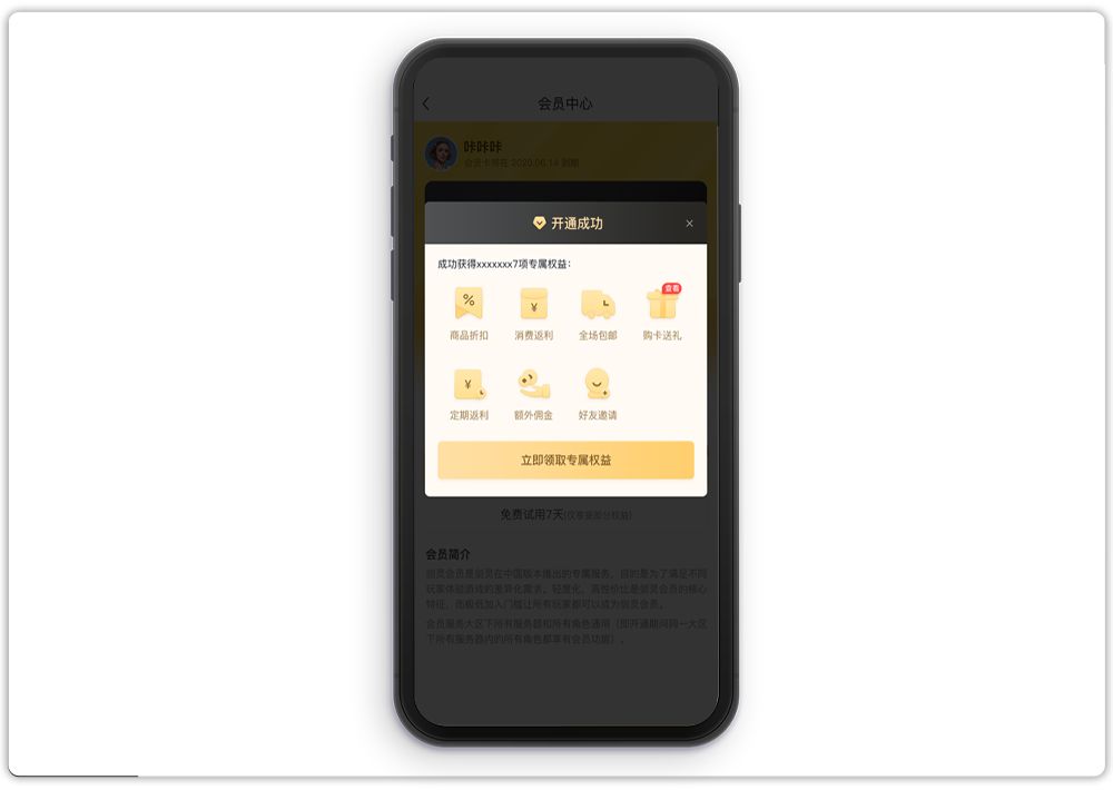 用户通过消费,获得商家提供的多类型的会员权益,例如商品折扣、消费返利、额外佣金等;