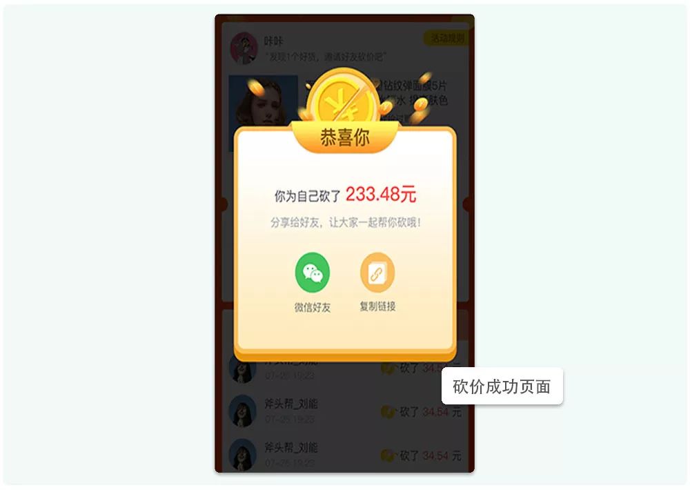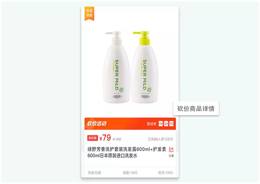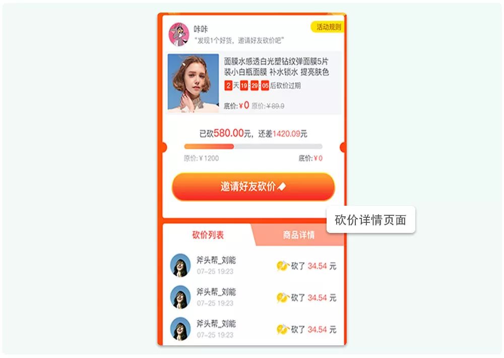 用户为达成目标价格不断自发分享产品,好友在帮助砍价过程中接触活动,产生二次分享及三次分享,分享范围呈指数增长不断扩大。
