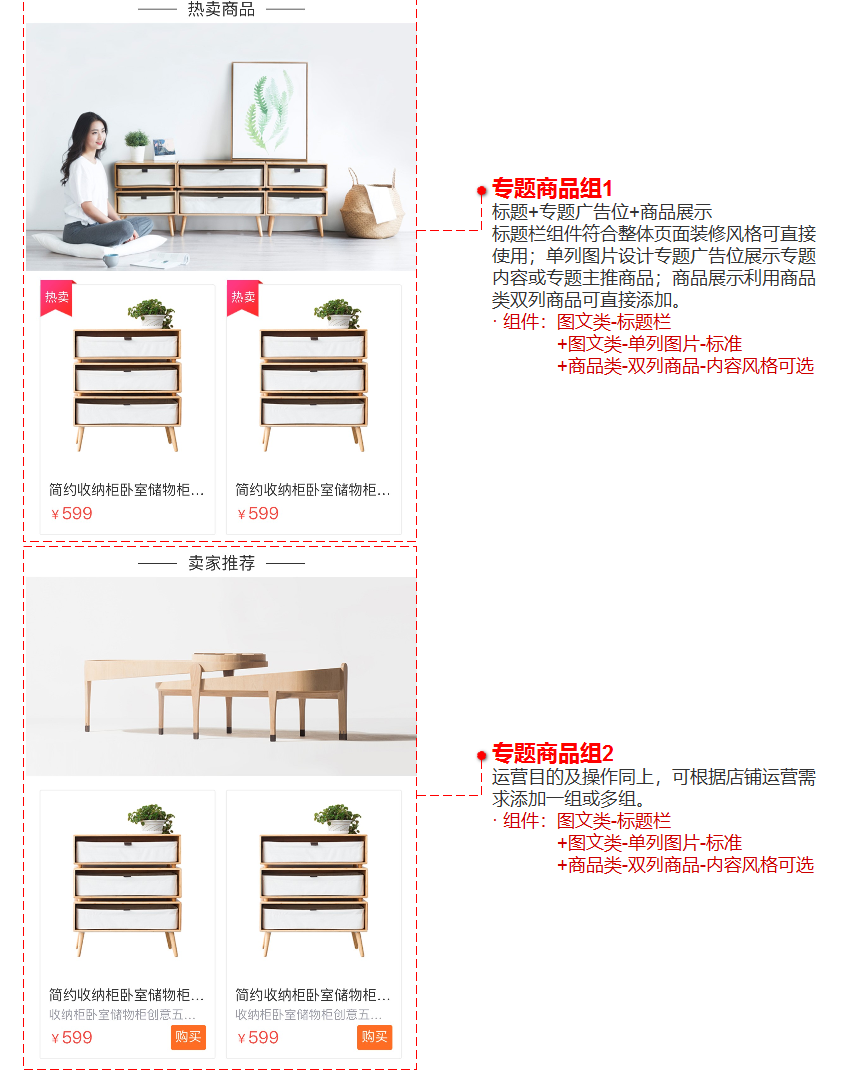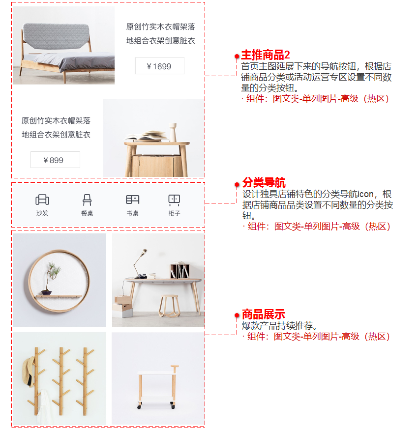 使用组件:固定搜索框、图片轮播、单列图片、单列图片热区、按钮组、商品其他类型、双列商品