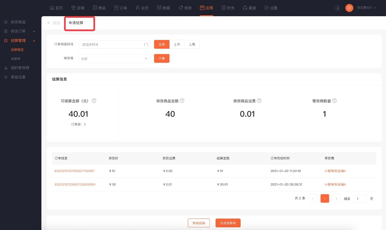 ·系统将根据订单完结时间计算出供货结算单,供货商生成结算单后向带货商申请结算,带货商需要根据结算单信息与供货商完成结算。