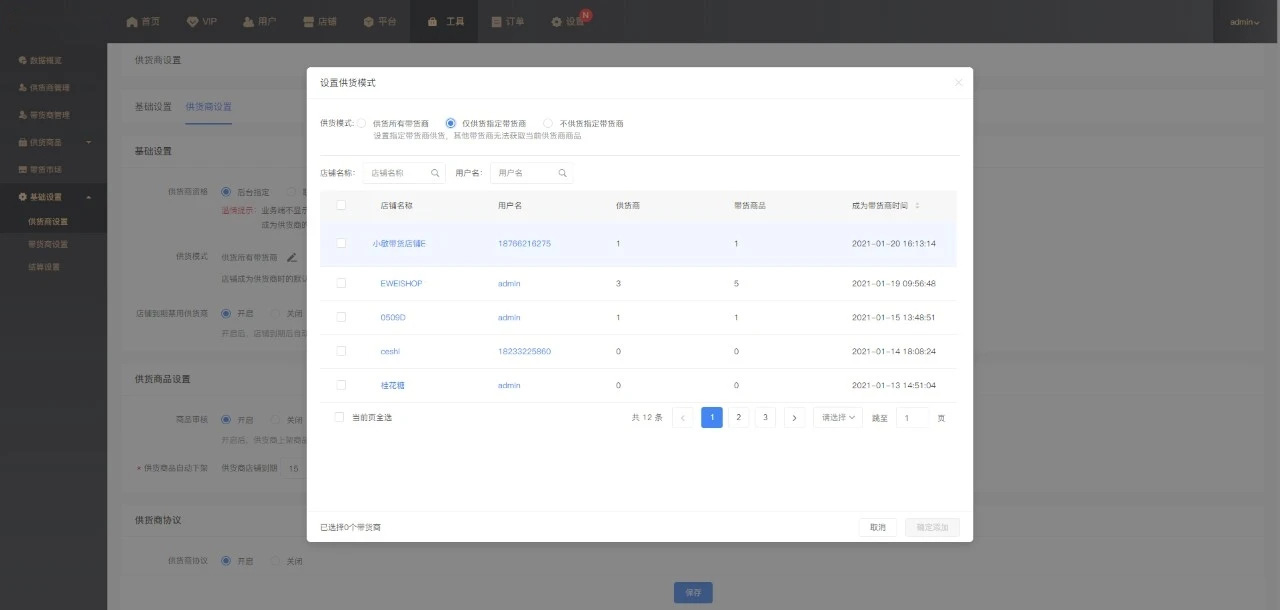 ·可灵活设置和管理供货商的供货模式:供货所有带货商,仅供货指定带货商,不供货指定带货商。