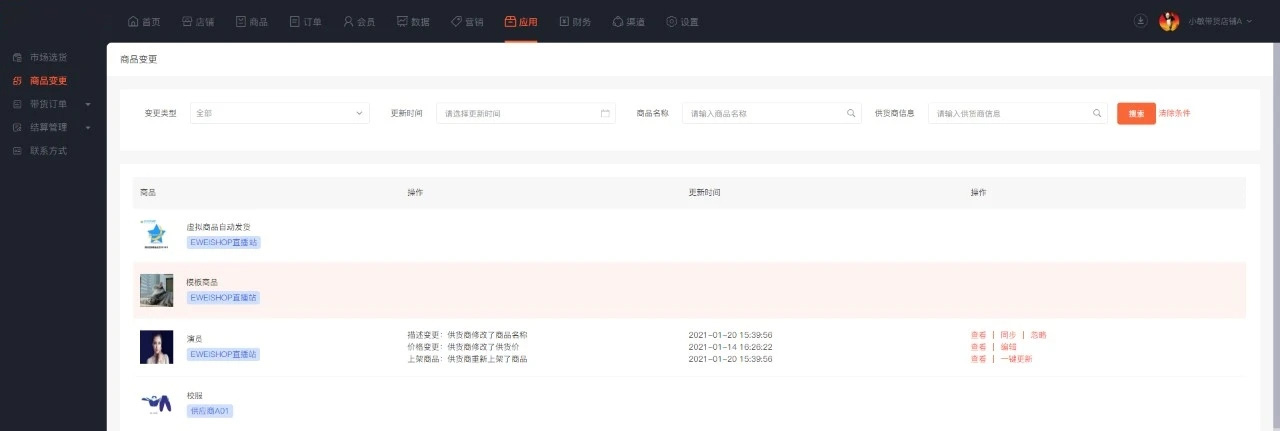 ·带货商可在商品变更页面实时获取供货商的商品变更信息,根据自己的需求可以同步变更信息到自己的商品详情或忽略。