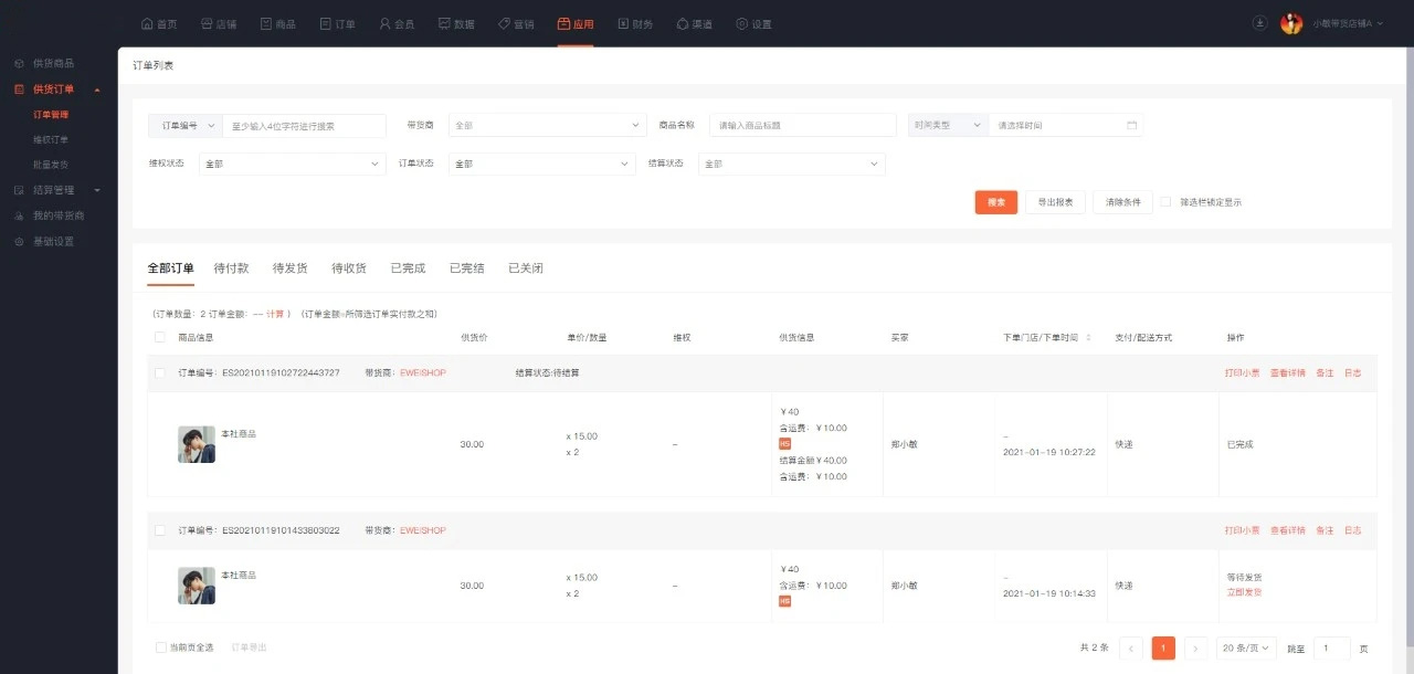 ·带货订单将显示商品供货价、供货结算金额和供货商信息,带货订单需要由供货商发货。