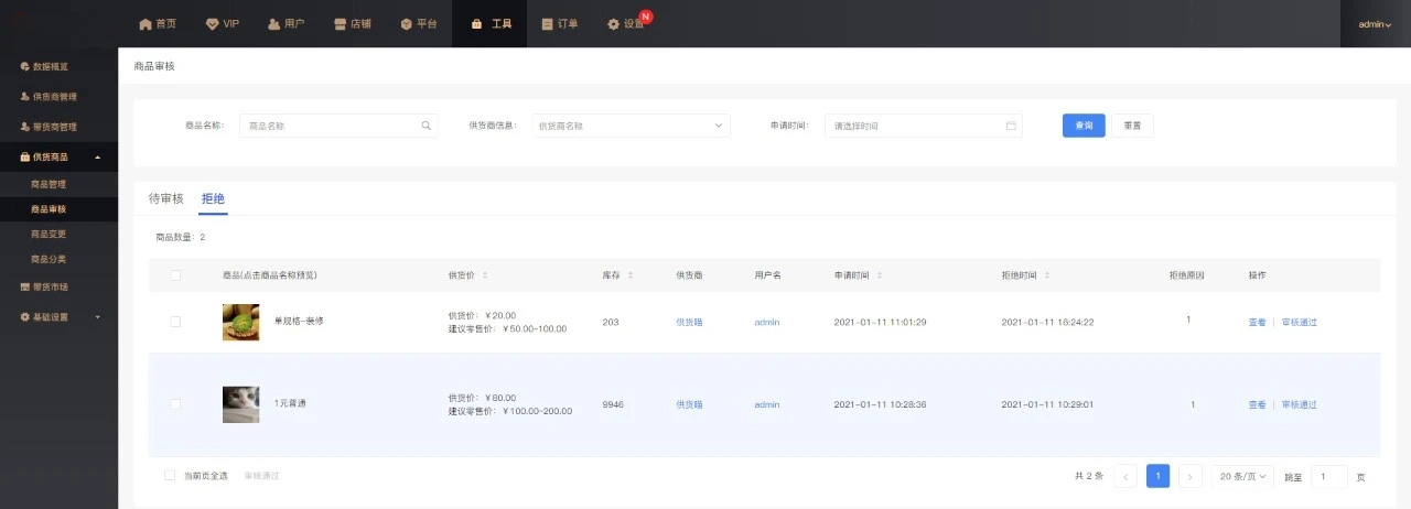 ·可开启供货商品审核功能,仅通过审核的商品才可以上架到带货市场。
