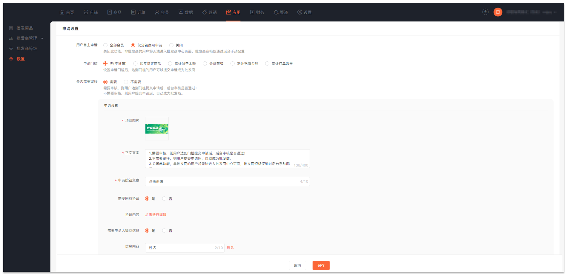 · 可设置申请批发商的门槛和升级条件,如:购买指定商品、累计消费金额、会员等级等。