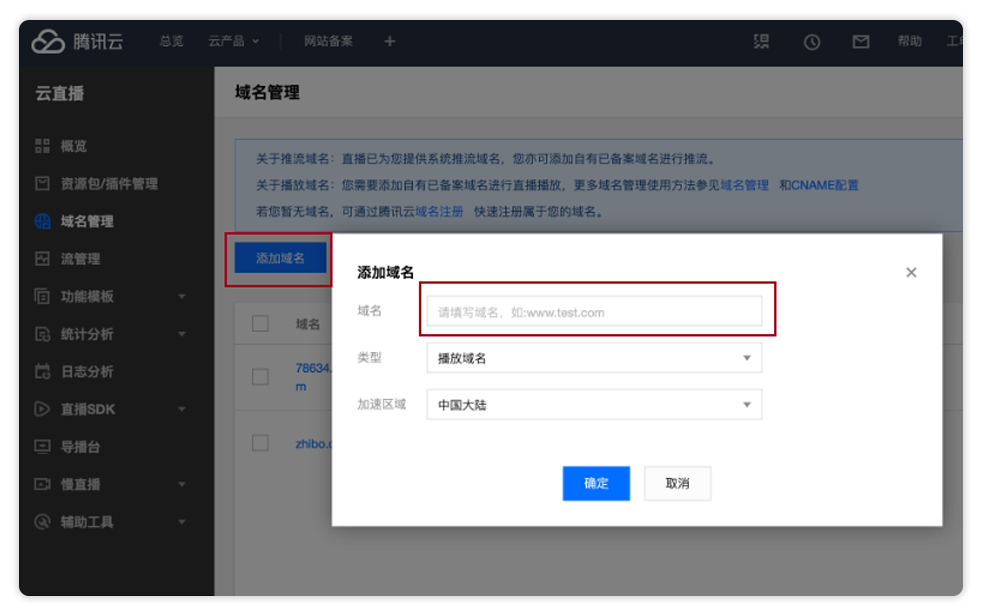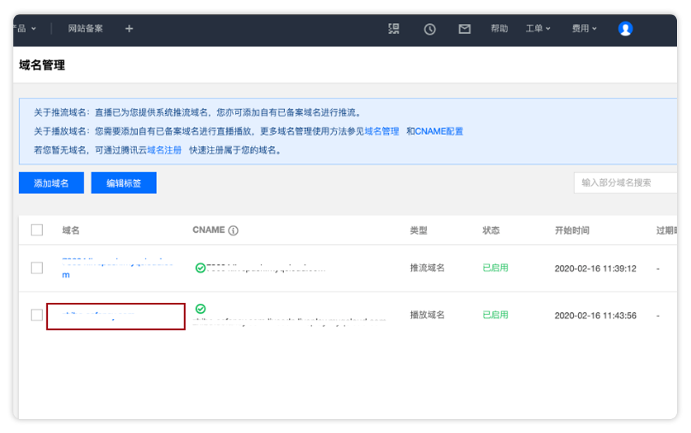 4、添加播放域名:在腾讯云直播域名管理页面添加播放域名(需要已备案域名),复制配置好的播放域名添加到域名设置页面播放域名部分。