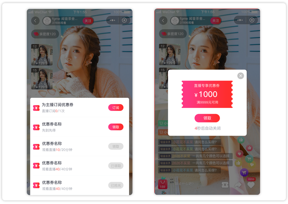 3、直播间优惠券:主播送券+直播间优惠券两种送券方式,用户可通过完成相关任务领取优惠券;有效提升粉丝活跃度,激发用户购买欲。
