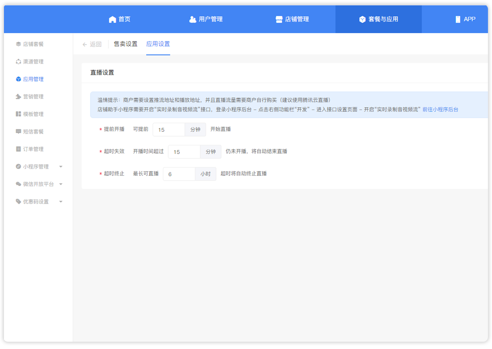 您可在XINYUSHOP管理端进行提前开播、超时失效、超时终止等功能的设置,把控每一场直播进程。