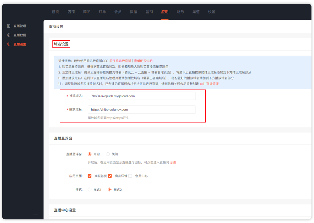 3、添加推流域名:腾讯云直播将提供推流域名(腾讯云 - 云直播 - 域名管理页面),复制推流域名添加到域名设置页面推流域名部分;
