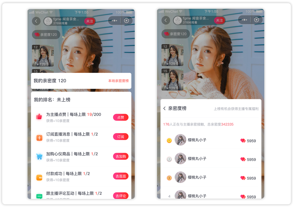 1、亲密度:粉丝通过完成任务(点赞、订阅、分享等),提升亲密度排行榜名次;从而增强直播间互动率,打造商城人气。
