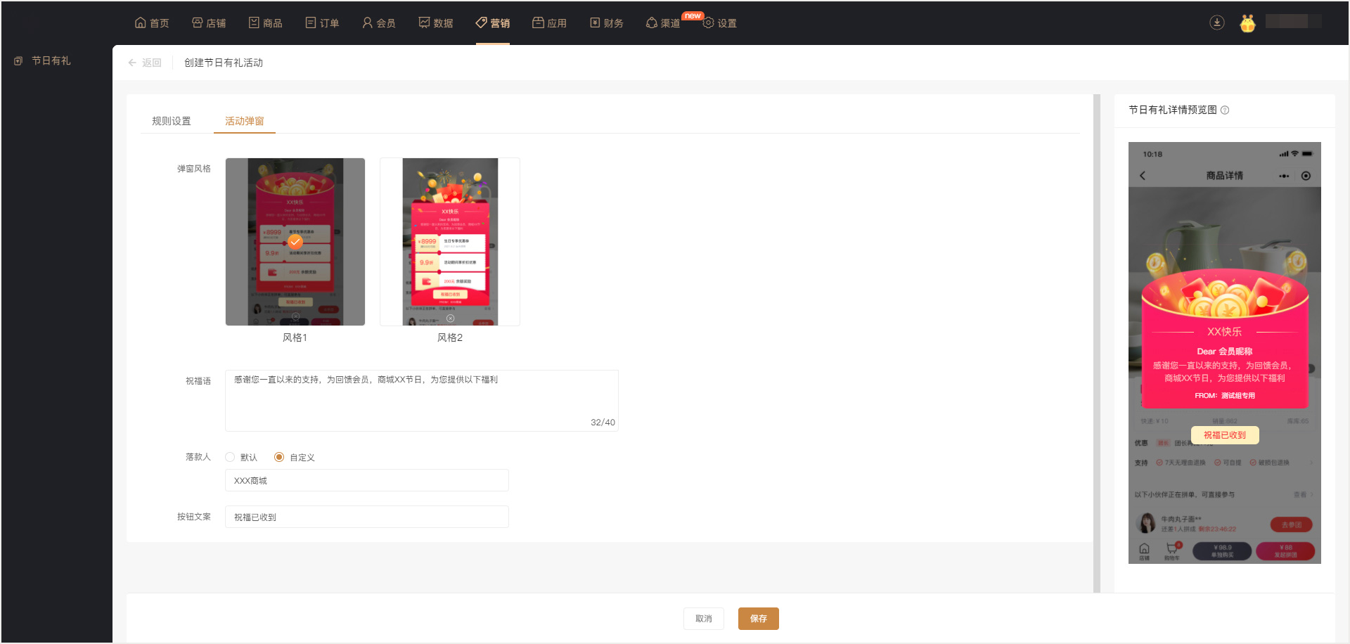 商家可自定义节日弹窗的样式和内容,强调节日仪式感,增强会员黏性。