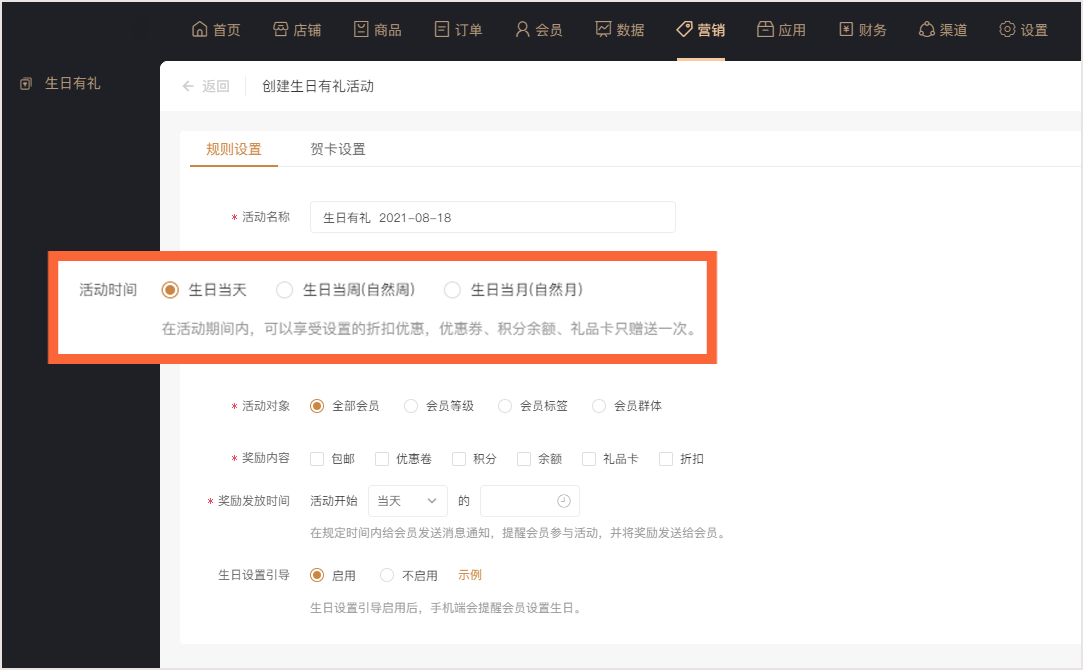 生日礼包含包邮/赠送优惠券/赠送积分/赠送余额/赠送礼品卡/打折六种类型,且可以从中选择多种奖励赠送给会员。