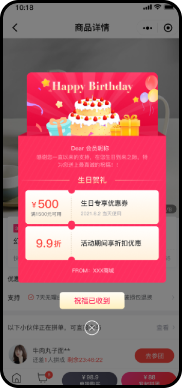 以生日场景为核心,在会员生日时赠送生日礼,带给会员具有仪式感的个性化体验,帮助商家与会员建立更多的场景互动,持续激活用户,增加复购转化。